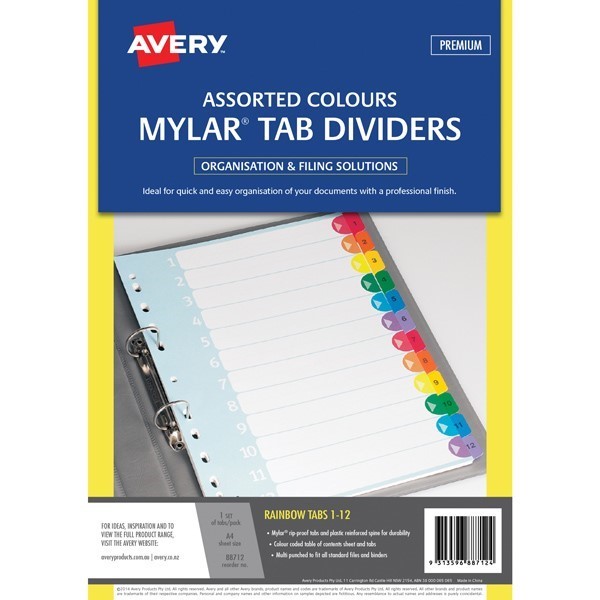 Avery 88712 Pre-Printed Dividers 1-12 Tab A4 Multi-Coloured