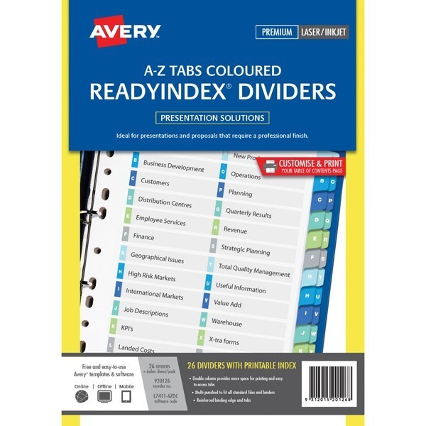 Avery 922007 Customisable Table of Contents Dividers A-Z Tabs A4 Landscape/Portrait