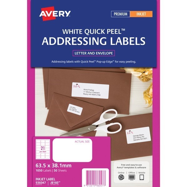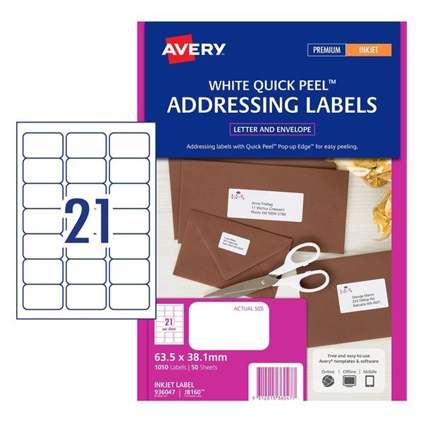 Avery 936097 J8160 Address Labels Inkjet 63.5 x 38.1mm 21 Per Sheet Pack 50