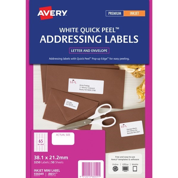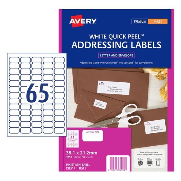 Avery 936099 J8651 Quick Peel Address Labels with Sure Feed Inkjet 38.1 x 21.2mm 65 Per Sheet Pack 50