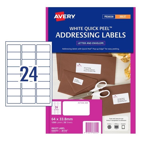 Avery 936107 J8159 Address Labels Inkjet 64 x 33.8mm 24 Per Sheet Pack 50