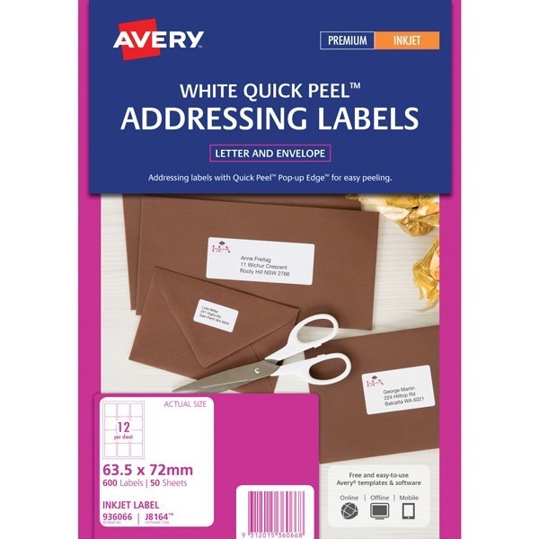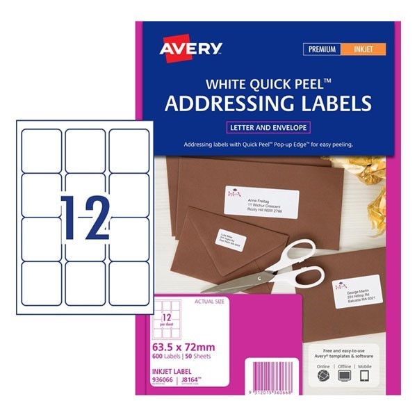 Avery 936116 J8164 Quick Peel Address Labels Inkjet 63.5 x 72mm 12 Per Sheet Pack 50
