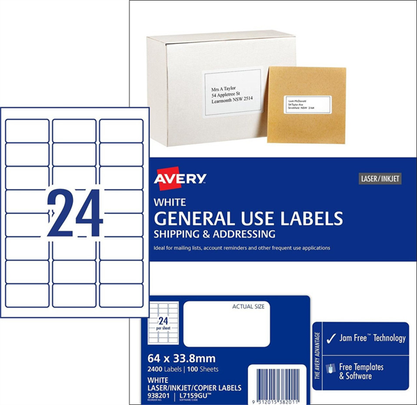 Avery 938201 General Use Labels 64 x 33.8mm 24 Per Sheet Pack 100