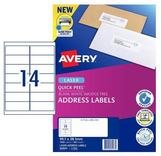 Avery 959004 Quick Peel Address Labels with Sure Feed Laser 99.1 x 38.1mm 14 Per Sheet Pack 100