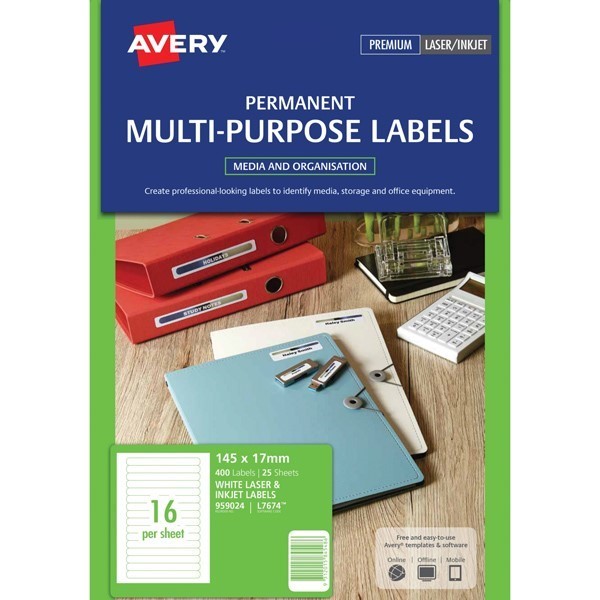 Avery 959024 L7674 Permanent Multi-Purpose Labels Inkjet 145 x 17mm 16 Per Sheet Pack 25