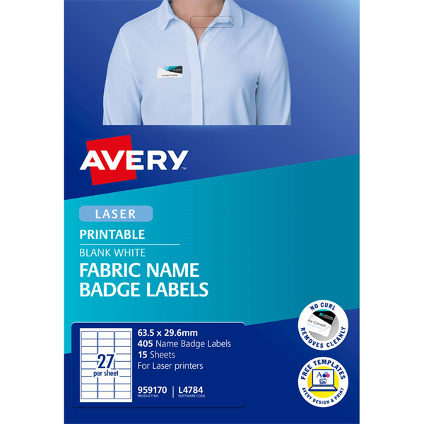 Avery 959170 Fabric Name Badge Labels Laser 29.6 x 63.5 mm 27 Per Sheet 15 Sheets