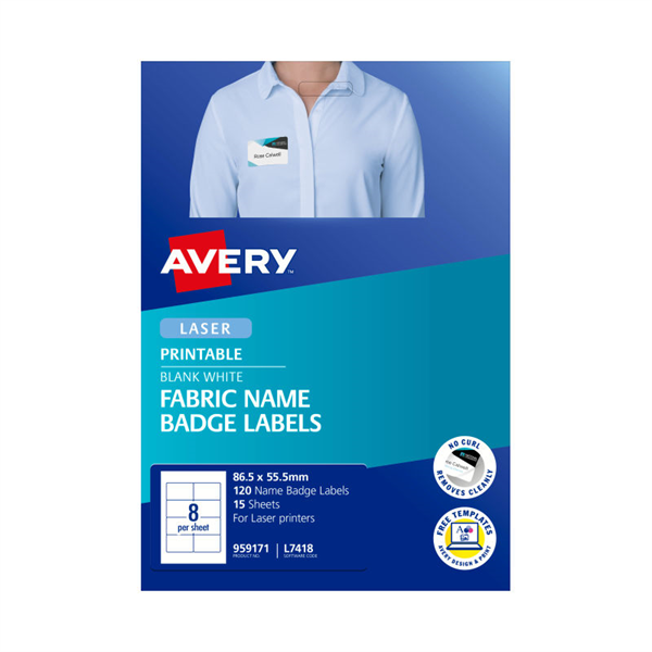 Avery 959171 Fabric Name Badge Labels Laser 55.5 x 86.5mm 8 Per Sheet 15 Sheets