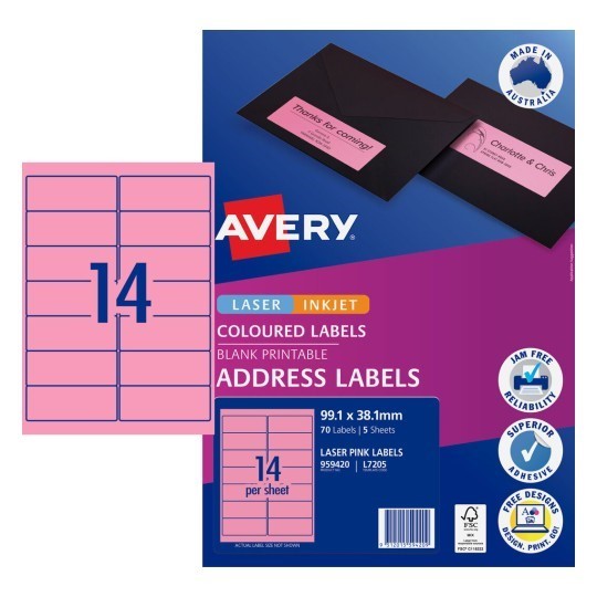 Avery 959420 Address Labels Laser Inkjet 99.1 x 38.1mm 14 Per Sheet Pink Pack 5