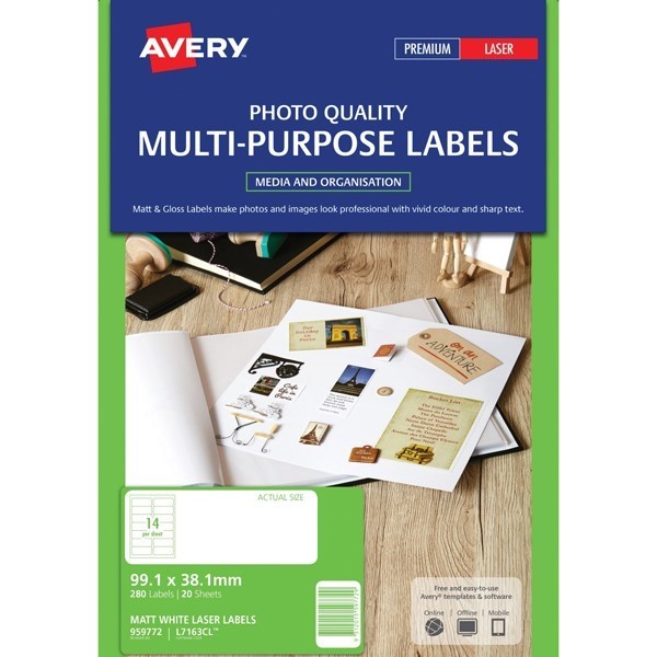 Avery 959772 L7163CL Matt Photo Quality Labels Laser 99.1 x 38.1mm 14 Per Sheet Pack 20