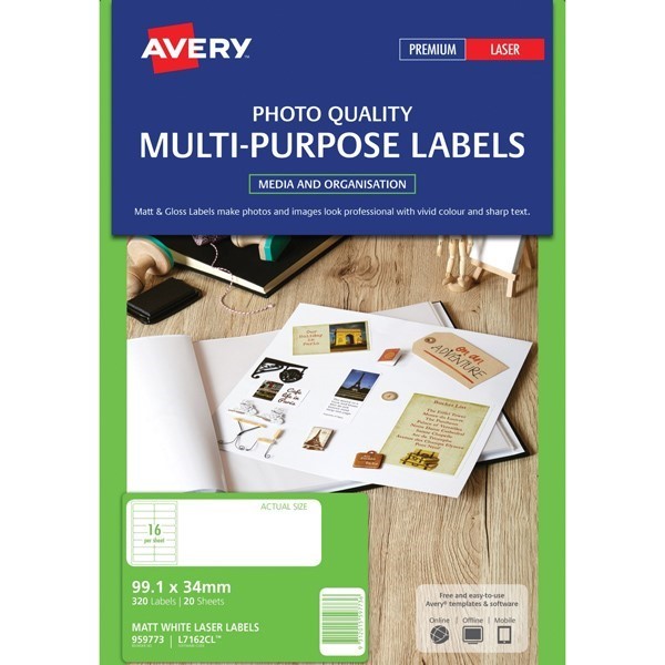 Avery 959773 L7162CL Matt Photo Quality Labels Laser 99.1 x 34mm 16 Per Sheet Pack 20