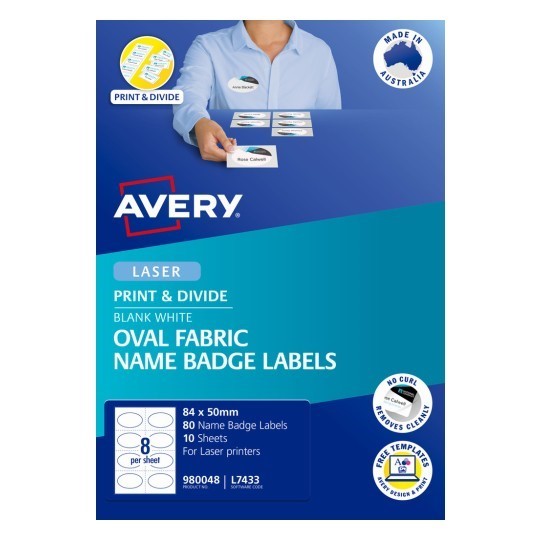 Avery 980048 Oval Fabric Name Badge Labels Laser 84 x 50mm 8 Per Sheet 10 Sheets