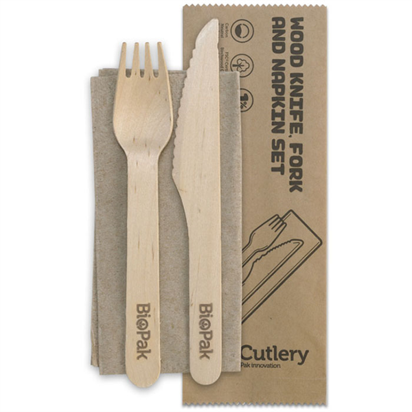 BIOPAK Bio Wood Cutlery 16cm Fork Knife Napkin Set Pack 100