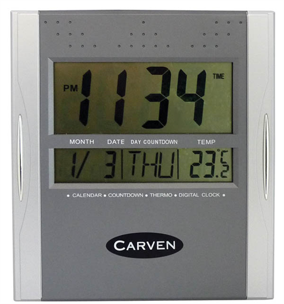 Includes; month, date, day, Displays current temperature (Switchable to c or f) and has an alar