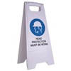 Cleanlink Safety Sign Head Protection Must Be Worn is a light weight flat fold A-frame in bright white, drawing attention to ensure safety.