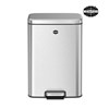 Fingerprint resistant brushed stainless steel finish.Soft close lid.Lift the lid by hand to 90 degrees to engage the stay-open mechanism.Removable plastic liner.
