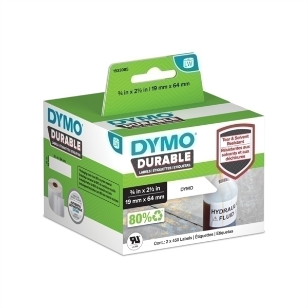 Dymo LabelWriter Durable Multi Purpose Labels 19mm x 64mm feature industrial-strength adhesive and a rugged coating that resists peeling and abrasion caused by moisture and solvents
