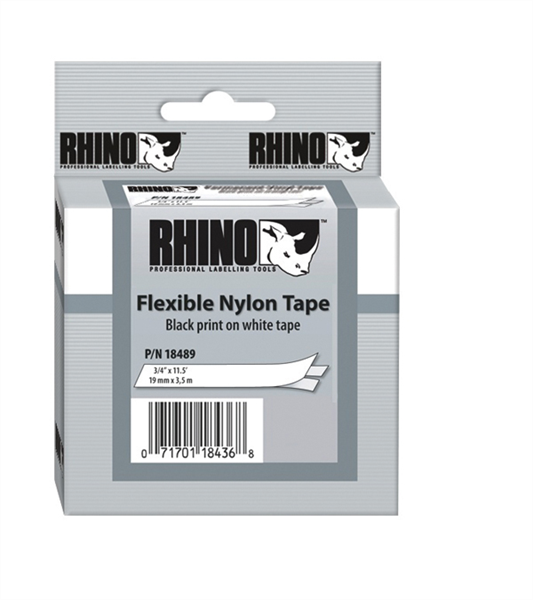 Dymo Rhino 18489 Tape Flexible Nylon Black on White 19mm