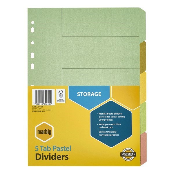 Marbig 37000F Dividers 5 Tab A4 Manilla Pastel